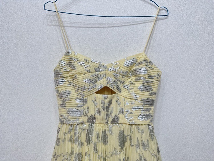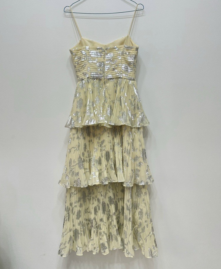 2023年春夏新品女装性感迷人黄色雪纺烫金百褶蛋糕长款吊带连衣裙