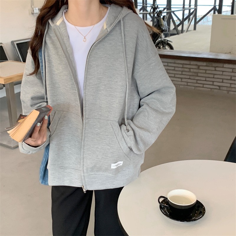 韩版宽松BF风长袖开衫连帽卫衣休闲外套女2023春秋学院风纯色上衣