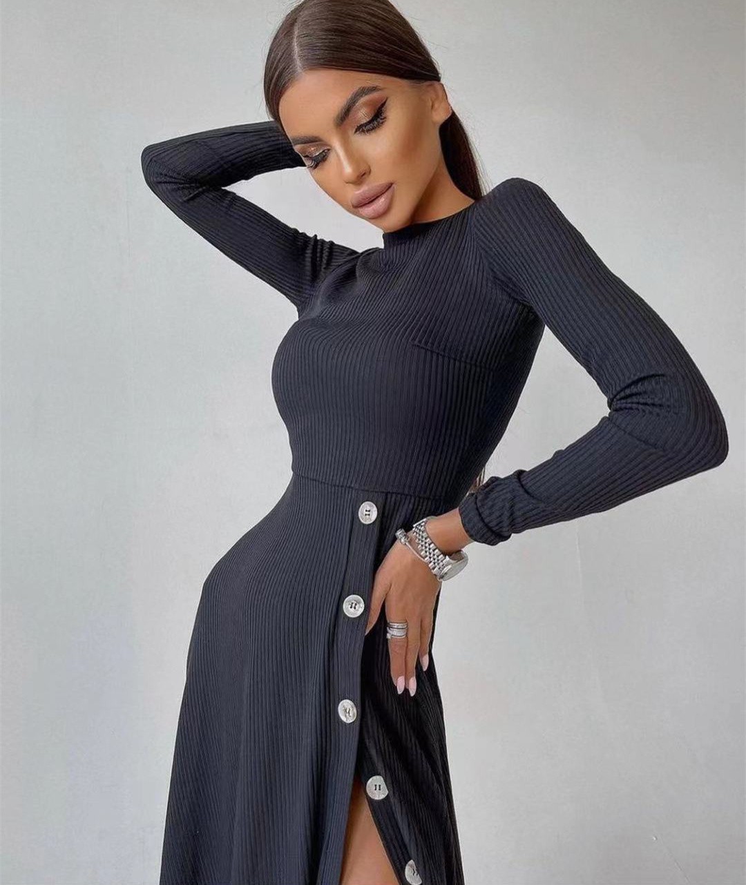 ins2023外贸欧美风秋冬新款不规则性感开叉包臀高腰中长裙连衣裙